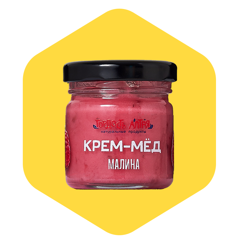 Крем-мёд с малиной — натуральный десерт на основе цветочного мёда из Алтая с добавлением цельных кусочков малины. Благодаря технологии холодного взбивания мёд приобретает нежную, густую консистенцию, которая удобно намазывается и не течёт.